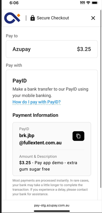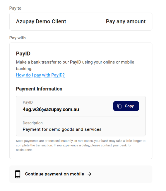 Azupay's Pay by Bank checkout UX now remembers a payer’s previously used payment method and defaults to it on future transactions. If a payer has successfully completed a payment using PayTo or PayID with any Azupay merchant in the past, and the current merchant supports PayTo payments for its customers, Azupay's Pay by Bank UX will automatically land on that same payment method when a new transaction is created.