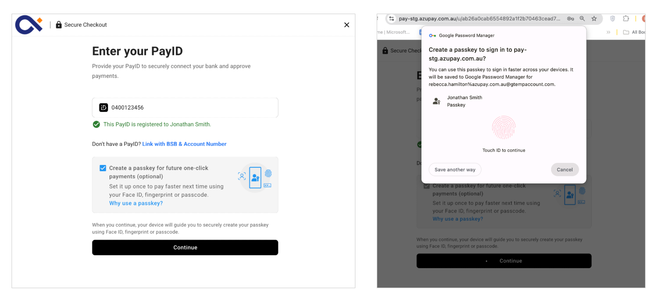 - Collect payment and setup a recurring PayTo agreement associated with a Passkey