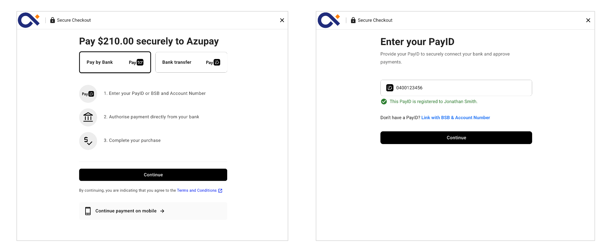 - Azupay performs pre-requisite checks to ensure the user is eligible to continue with the payment and confirms the PayID entered is registered