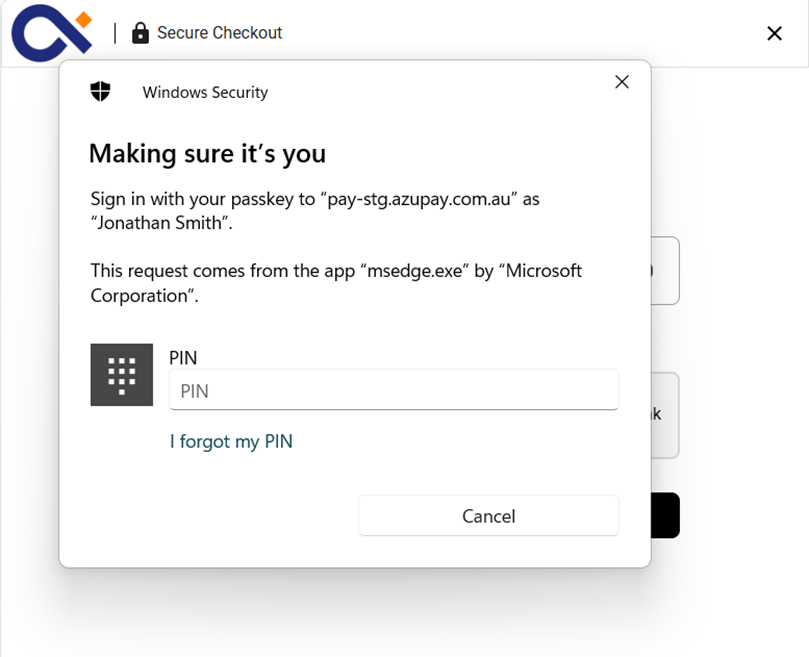 - User is prompted to set up a passkey for payments. The device browser will ask them to authenticate using fingerprint, face biometrics or PIN for that device and confirm that a passkey has been saved