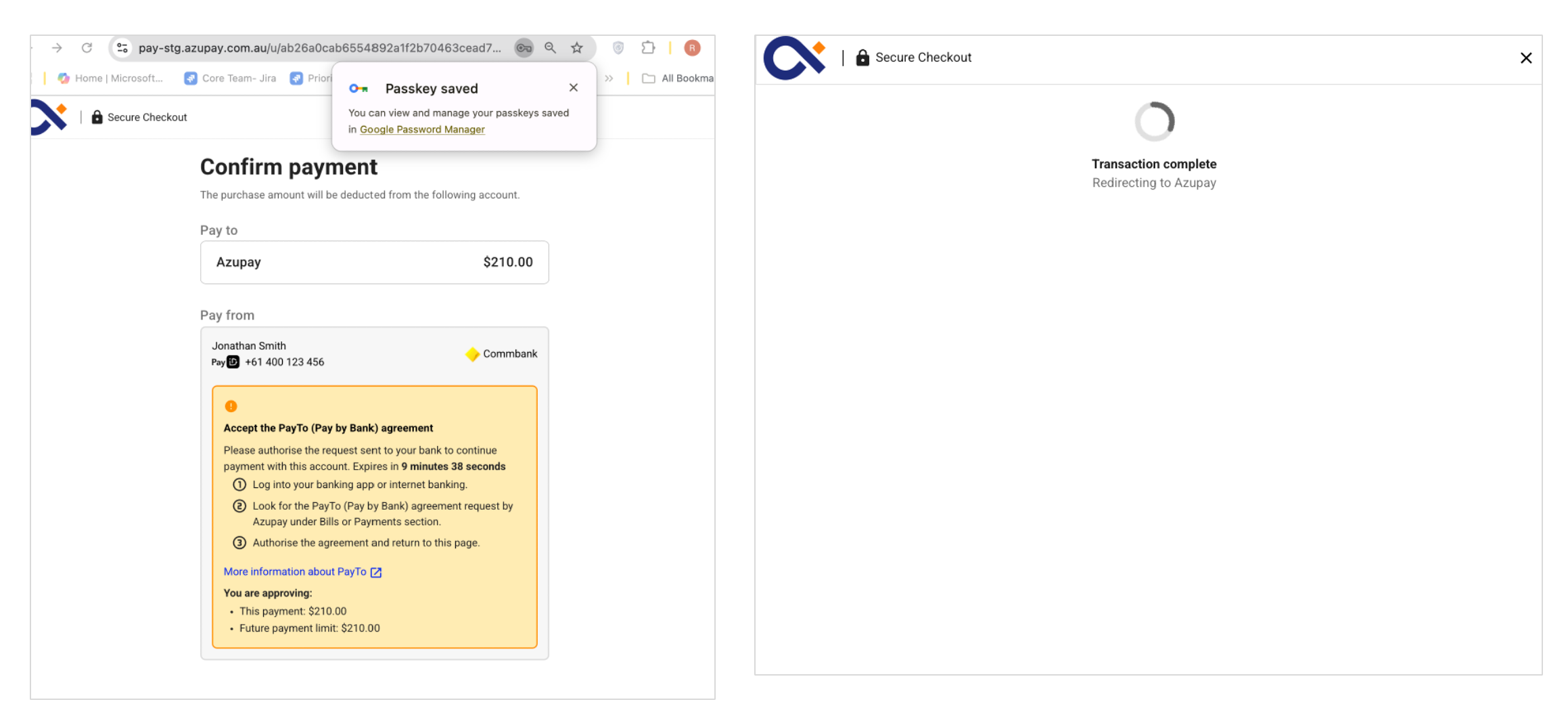 - Upon successful setup of passkey on the customer's chosen device, a confirm payment screen is shown to the user asking them to approve the PayTo agreement in their online banking or mobile banking app