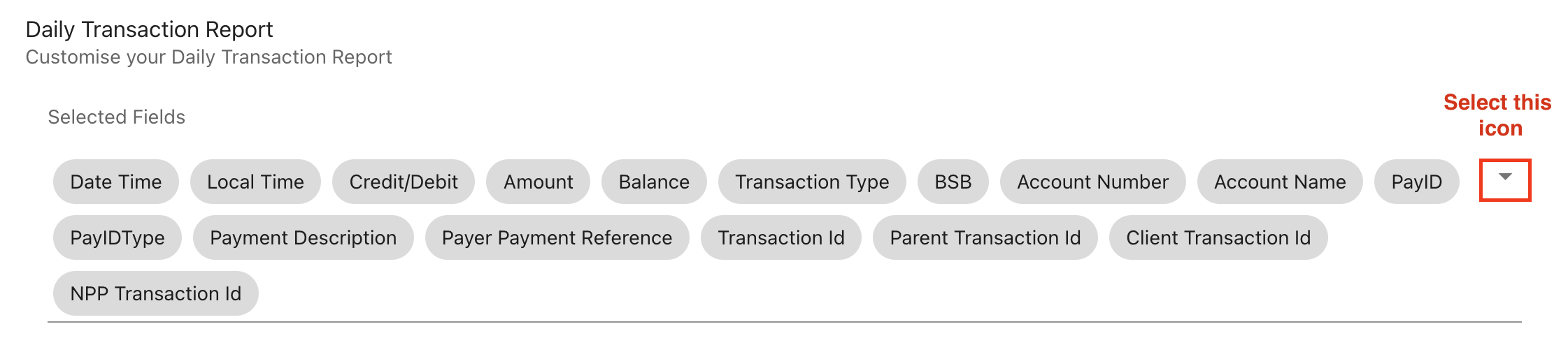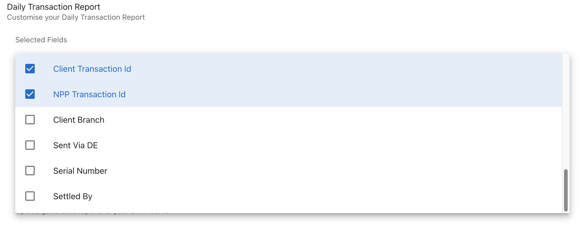 Client dashboard users can specify the fields they want to see in their daily transaction report.