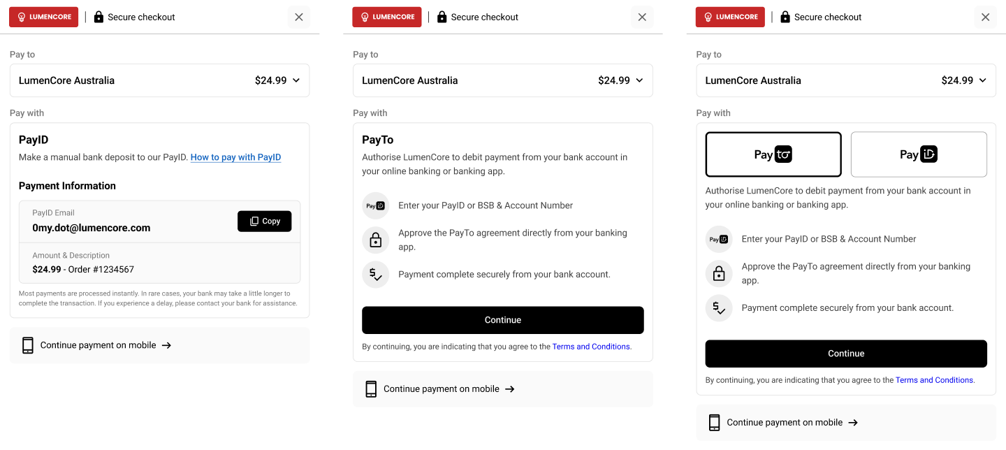 If both PayID and PayTo are enabled, you can choose which payment option the customer sees first.