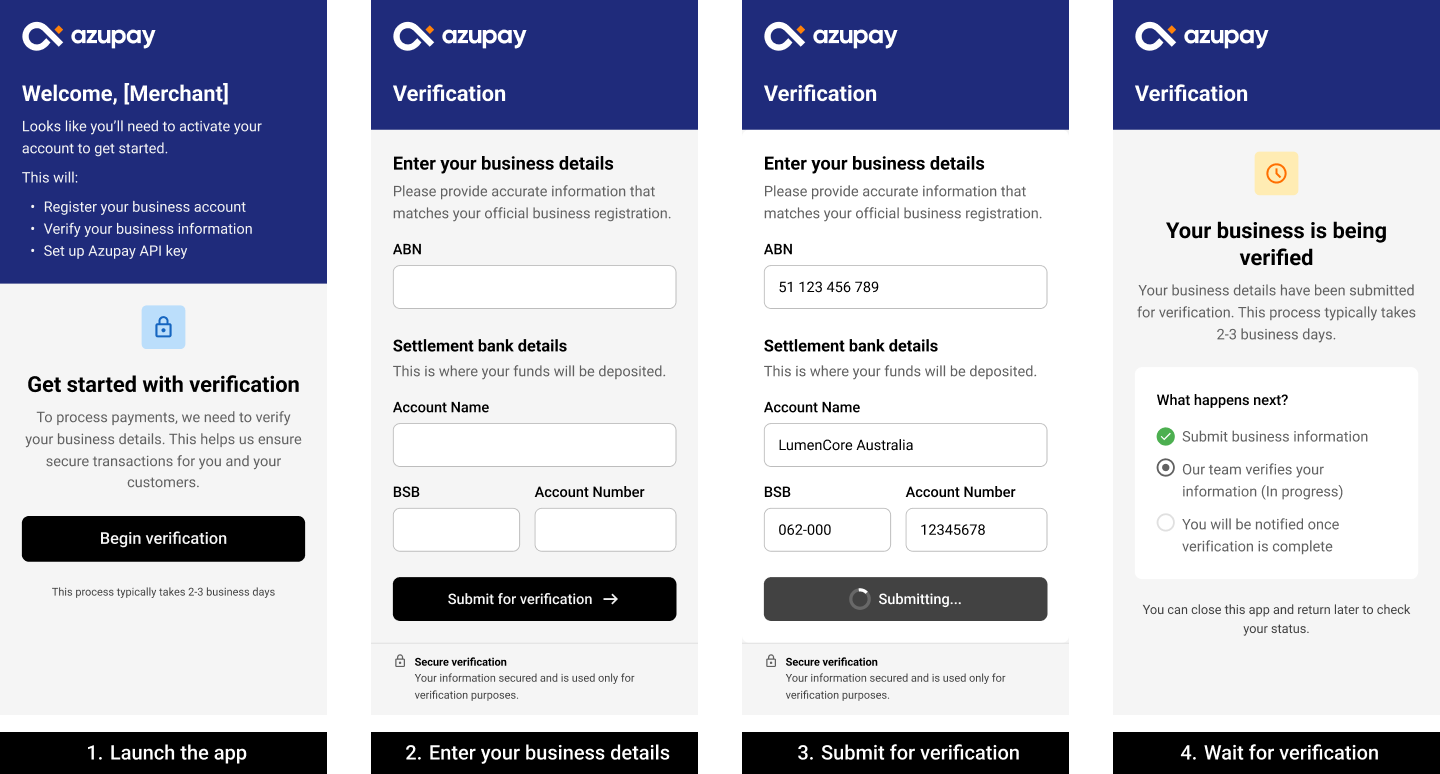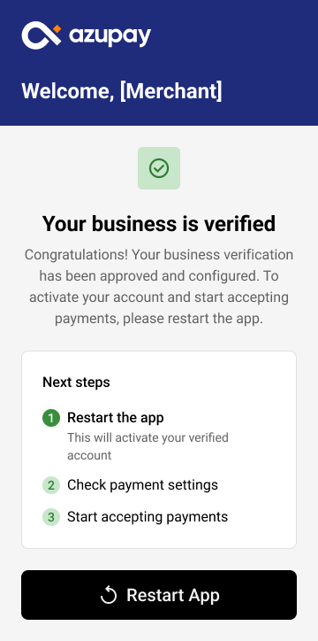 If you experience issues during onboarding or have questions about your verification status, please contact Azupay Support or your Azupay account representative.